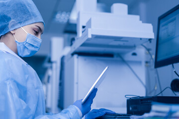 Scientist analyzing covid-19 data on digital screen in lab