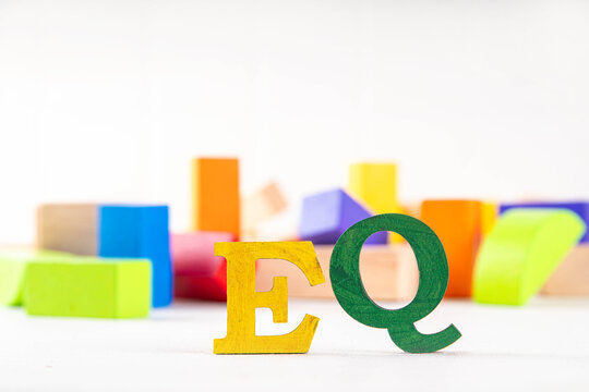 EQ (Emotional Quotient) sponge text on child hands. Education and development concept.