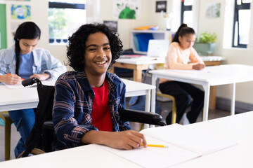 Smiling boy in wheelchair writing in classroom, enjoying school activities