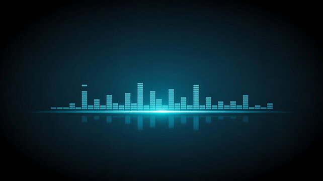 Abstract glowing blue equalizer bars reflecting on a dark surface with a subtle glow
