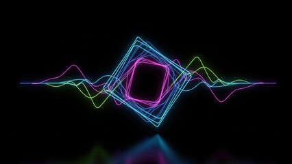 Dynamic neon wave patterns surround glowing abstract squares in a vibrant digital sound