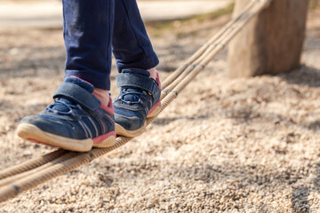 Slackline in Children Playground. Child Legs on Slackline on Nature Background.