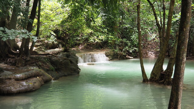 Cascading Erawan Falls in Erawan National Park, Thailand. Lush green forest surrounds the flowing water. Tropical trees and plants frame the scenic waterfall setting.