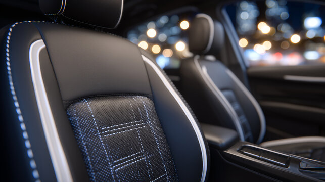 Close-up of ergonomic leather car seats, intricate stitching patterns on black or white leather, soft ambient light highlighting contours and textures, modern luxury interior