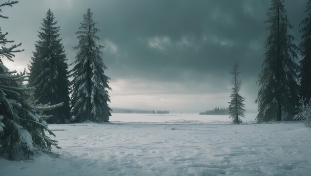 Snow-covered landscape featuring evergreen trees beneath a cloudy sky.