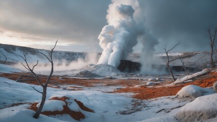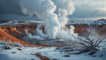 Steam billows from a geothermal vent in a desolate, snow-covered landscape.