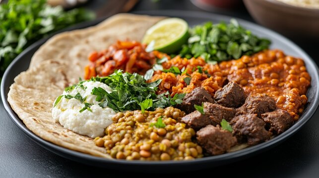 Eritrean injera platter featuring colorful lentil and meat stews, served with fresh herbs and lime in warm natural light