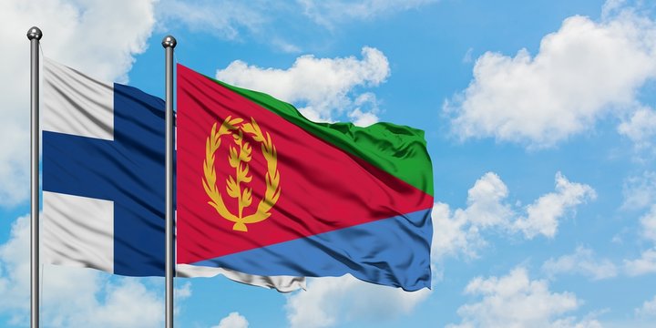 Finland and Eritrea flag waving in the wind against white cloudy blue sky together. Diplomacy concept, international relations.