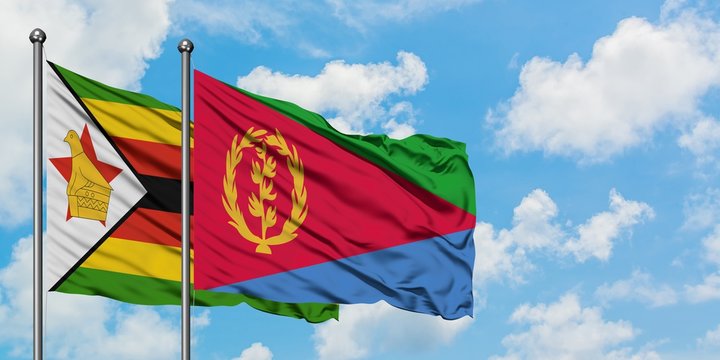 Zimbabwe and Eritrea flag waving in the wind against white cloudy blue sky together. Diplomacy concept, international relations.