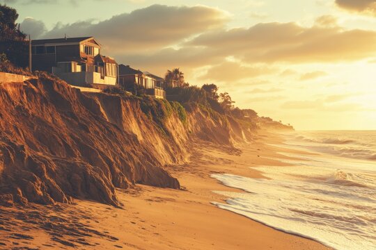 Coastal erosion - houses built on weak clay soil slide down to the sea and collapse near Odessa, Ukraine