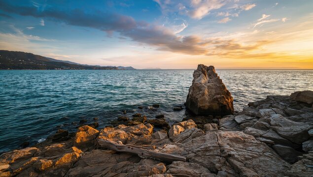 Serene sunset over ocean landscape with rocky shoreline