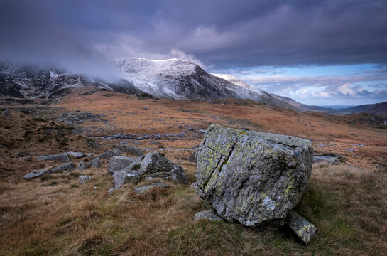 Glacial Erratic Boulder backed by the Glyderau Mountains, Cwm Idwal, Snowdonia National Park, Eryri, North Wales