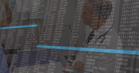Analyzing error logs doctors viewing digital display in office with tablet, folder and stethoscopes