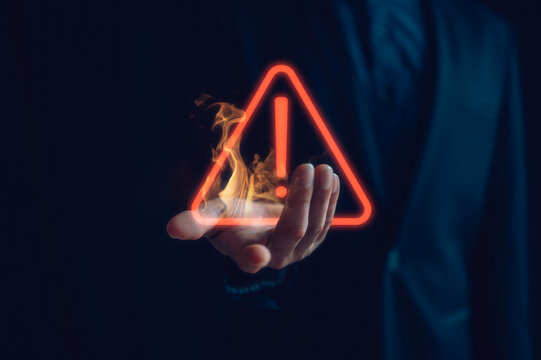 Danger and error alert concept. Businessman shows symbol notification warning triangle. Maintenance of security systems, anti-virus protection, and protection against hacking of sensitive data