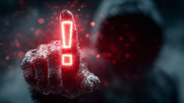 Urgent warning alert symbol glowing red with a shadowy figure touching it, representing danger and critical notification