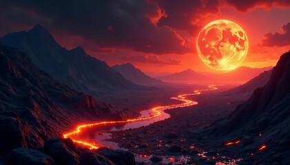 Imaginary volcanic fissure with glowing lava on alien landscape