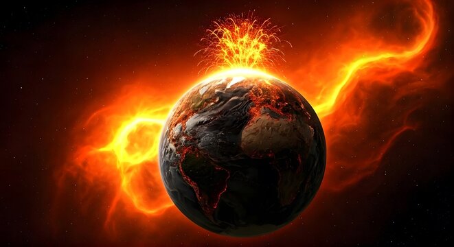 A fiery cosmic scene captures an erupting planet surrounded by asteroids and vibrant light, embodying the intensity and chaos of space.