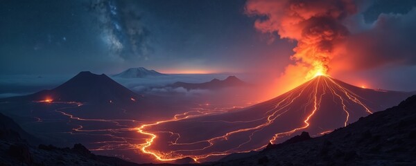 Fiery volcano eruption with flowing lava and dramatic ash cloud