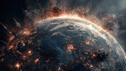 Cataclysmic event erupting from a planetary surface with a large explosion and lava flow