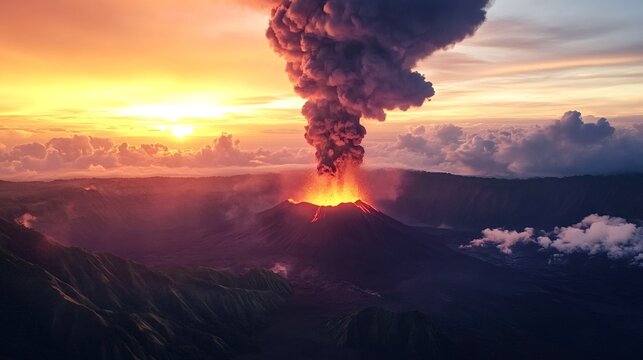 Volcano erupting at sunset, creating a breathtaking spectacle of nature