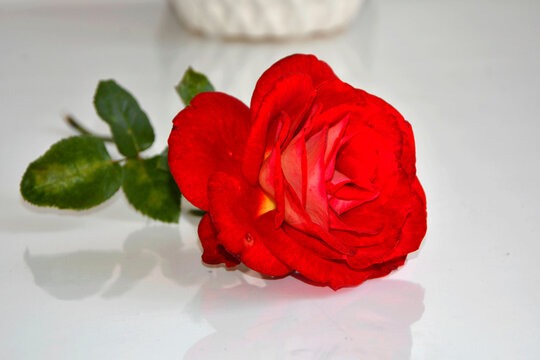 czerwona róża na stole, czerwona róża odbijająca sie w szkalnym blacie stołu, Red rose on white table