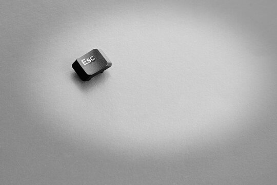 Escape key on a light background in a beam of light, black-and-white picture, end of work, only way out, one solution, no options