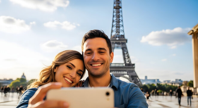 Enamored couple documenting their escapade in Paris with the Eiffel Tower as the backdrop, capturing a moment of shared joy and affection amidst the iconic scenery of the city of lights and romantic