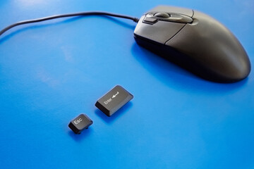 Enter and Escape key and computer mouse on light blue background, minimal requirements, minimalism in work, optimization of work, freedom of creativity
