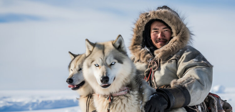 Portrait of an inuit man with his charismatic huskies looking on the camera. Banner with copy space