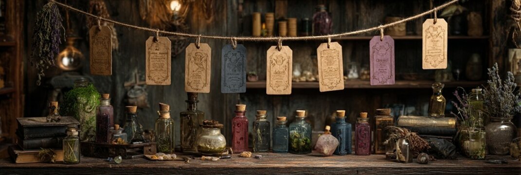 Mystical scene of a crystal wand and spell ingredients, ready for a witch to perform a powerful ritual and summon magical forces
