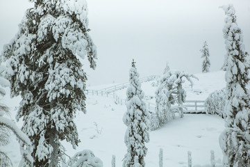 Conifer trees covered with white snow growing in cold Lapland countryside