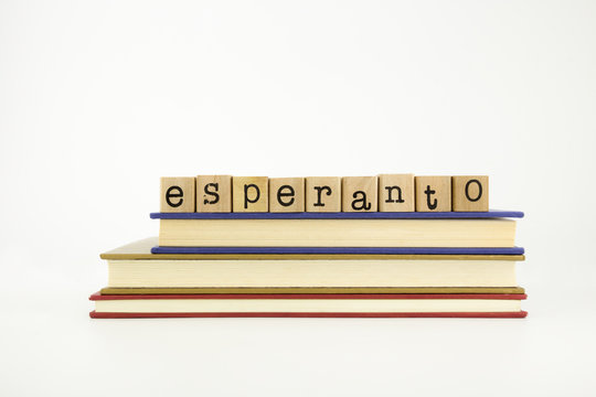 esperanto language word on wood stamps and books