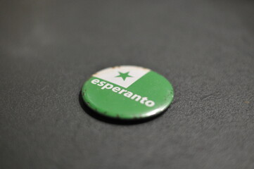 round flat esperanto pin laying on a gray counter