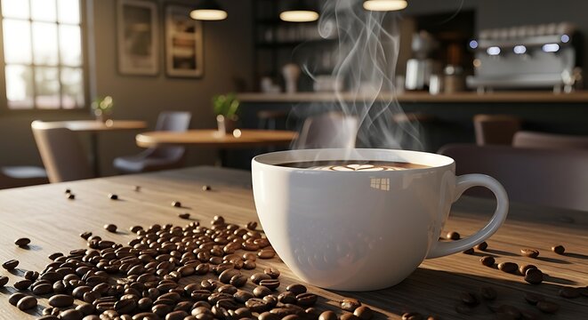 A steaming cup of coffee on a rustic wooden table, creating a warm and inviting atmosphere. The soft light enhances the rich colors of the coffee and delicate steam.