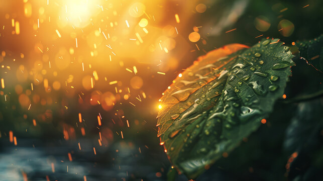 Close-up of an autumn leaf adorned with sparkling raindrops, capturing the essence of fall with a warm, golden glow.
