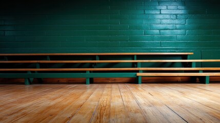 A simple yet striking depiction of empty wooden benches against a vivid green wall, illustrating the essence of anticipation and potential in a spacious gym environment.