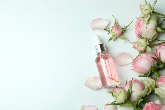 Skin care concept with essential rose oil on white background, space for text