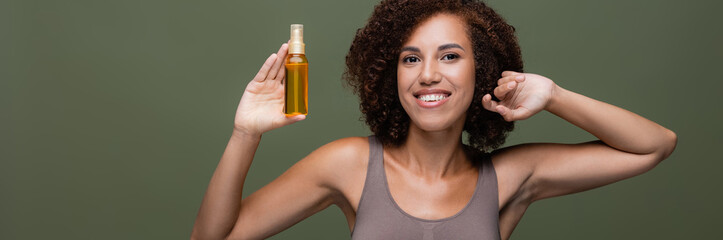 Bottles of essential olive oil and plant leaves in water on color background