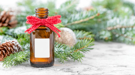Natural medicine or aroma oil or beauty essence concept vial. female hand with a dropper on wooden stand with green plant and golden brown background. Spa face and body care concept banner. copy space