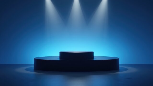 A Minimalistic Stage Features a Sleek Black Podium Surrounded by Soft Blue Gradient Lighting