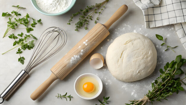 Culinary preparations with chef hat and utensils on rustic wooden table