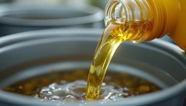 Golden liquid being poured from a bottle into a bowl filled with cooking oil during a culinary preparation at a home kitchen Generative AI