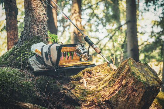 Bag with fishing essentials at riverside on sunny day