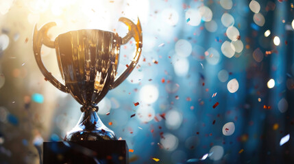 Shimmering Trophy Against a Backdrop of Blue Hues and Floating Confetti, Capturing the Essence of Celebration