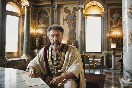 Marcus Aurelius, the esteemed former Emperor, philosopher and stoic writer of Rome, sits in his Imperial chamber of ancient Rome