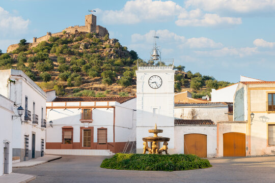 Clock Tower and Miraflores Castle in Alconchel, Badajoz, Extremadura, Spain