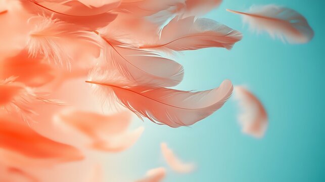 Delicate coral pink feathers floating against turquoise background create dreamy ethereal mood. Soft focus macro photography captures gentle movement and light.