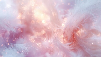 Delicate soft pink and white feathers create a beautiful dreamlike background texture bathed in warm shimmering bokeh light for an ethereal visual effect