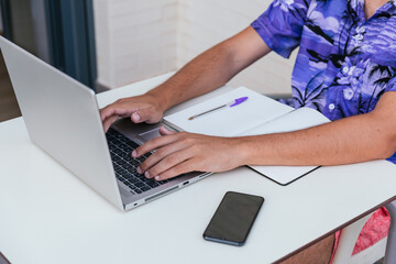 Unrecognizable young man working with laptop on terrace in swimsuit and blue hawaian shirt on white brick background. Concept: telework - cryptocurrency
