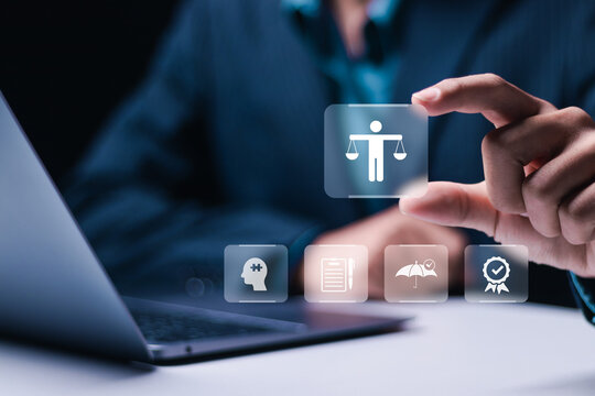 Business ethics Behavior and manners concept. ethical corporate culture. Business integrity and moral. Businessman use laptop with ethics icon on virtual screen.